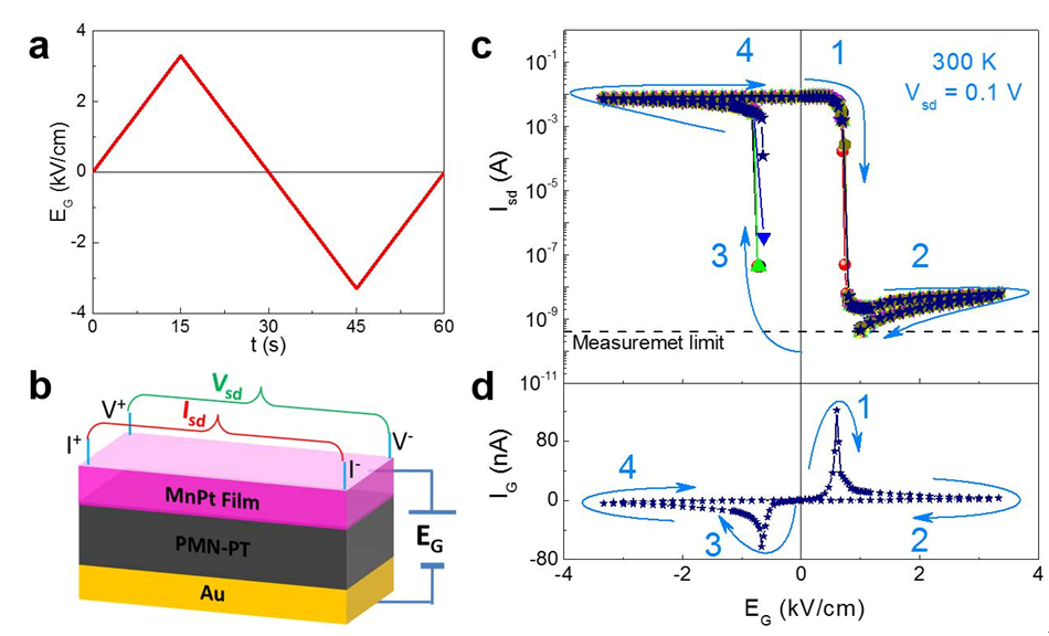 此项研究利用间金属纳米薄膜和铁电氧化物的异质结,实现了一种全新的电阻式记忆存储器件。铁电氧化物块体在周期性外加电场下,由于铁电畴的不均匀反转和畴壁应力,会产生纳米甚至微米尺度裂痕,这些裂痕对大多数铁电性能的应用非常有害。此项工作中,研究人员创新地利用了这种裂痕,将电阻率和力学延展性能均介于金属和陶瓷绝缘体之间的间金属薄膜集成到铁电氧化物基片上,成功实现了间金属薄膜中纳米裂痕在外加电场驱动下的可逆开关,从而产生了庞电电阻调制,高低阻态开关比>108。
