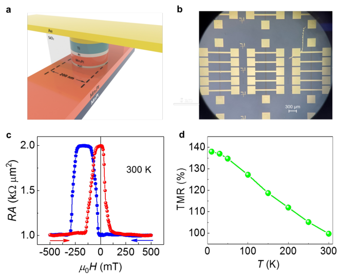 图2:全反铁磁隧道结微结构及功能特性。a.纳米尺度全反铁磁隧道结器件示意图;b.全反铁磁隧道结阵列光学显微图;c.室温隧穿磁电阻效应;d.隧穿磁电阻随温度的变化