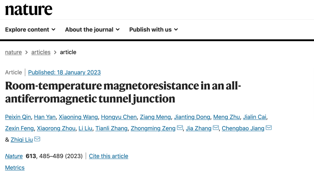 近期,yl23411永利官网yl23411永利磁性功能材料研究团队刘知琪教授、蒋成保教授等在磁存储材料研究方面取得进展,相关成果于1月19日以全文Article的形式在《Nature》杂志上发表,论文题目为:“Room-temperature magnetoresistance in an all-antiferromagnetic tunnel junction”。yl23411永利博士生秦培鑫为第一作者,yl23411永利为第一单位,刘知琪教授、蒋成保教授为第一单位通讯作者,华中科技大学物理公司张佳副教授、中国科公司苏州纳米技术与纳米仿生研究所加工平台曾中明研究员为合作单位及通讯作者。