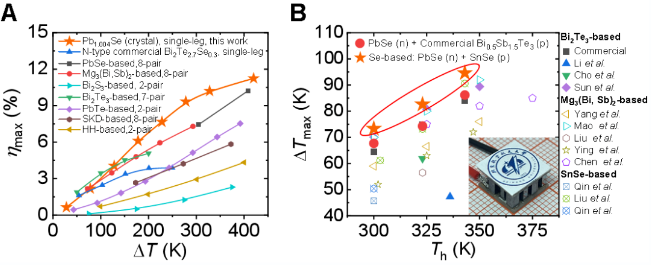 图3. (A) 发电效率对比图;(B) Se基和Bi2Te3基等材料器件的制冷温差对比