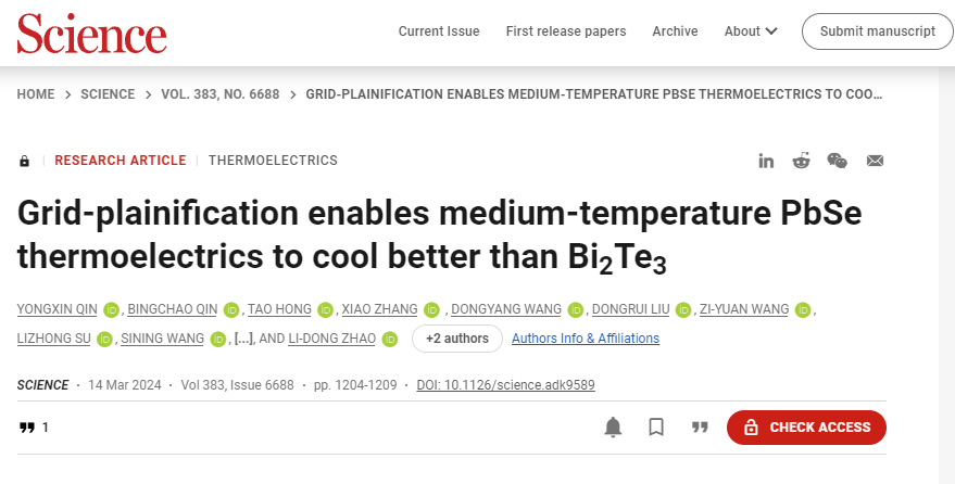 2024年3月15日,《Science》杂志报道了yl23411永利赵立东教授课题组在热电半导体制冷材料及器件研究上取得的最新进展:《Grid-plainification enables medium-temperature PbSe thermoelectrics to cool better than Bi2Te3》,该工作提出了一种“grid-plainification(栅格素化)”概念,通过使用物理气相沉积(PVD)生长晶体的方法,以及填补硒化铅(PbSe)晶格中的Pb空位,大幅削弱了晶格缺陷对载流子的散射,实现了载流子迁移率的显著提升。制备的热电器件在室温下实现了73.3K的最大制冷温差,并在420K温差下实现了11.2%的发电效率【Science 383 (2024) 1204-1209.】。北航2018级博士、卓越百人博士后秦永新,北航2019级博士、卓越团队博士后为第一作者;北航前沿科学技术创新研究院副研究员张潇和赵立东为通讯作者,yl23411永利为第一单位。这是赵立东教授课题组自2015年以来发表的第9篇《Science》。