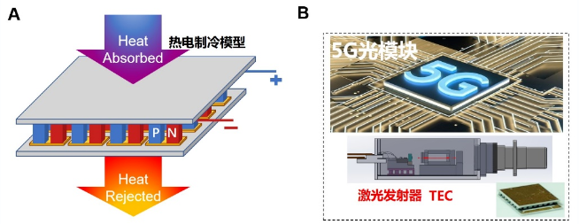热电制冷技术是一种利用帕尔帖效应直接将电能转换为热能的绿色制冷技术,仅通过调节工作电压和电流就可以实现对制冷量和温度的连续高精度控制(图1A)。热电制冷技术由于其控温精准、尺寸灵活、结构多样和局部冷却等众多优势,在精确制导、传感器和5G光模块等关键领域具有比其它制冷技术更强的竞争优势。因此,研发高效的制冷材料及器件,对于诸多科技自立自强等关键领域的精确温控具有重要意义(图1B)。