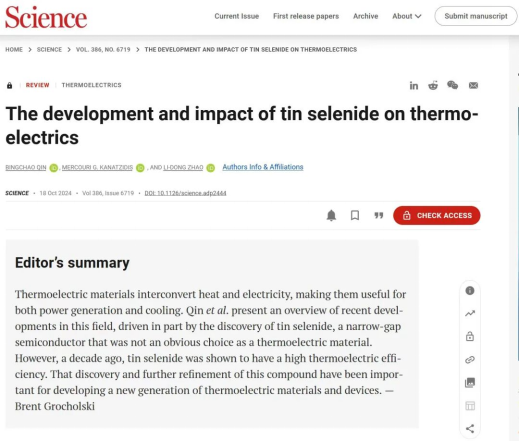 Science同期刊登的Research Highlights in Science Journals中,编辑团队以《Unexpected efficiency》为题,对本工作进行亮点报道。文中表示,热电技术近年来迅速发展的重要原因是源于SnSe基高效热电材料的发现,本工作对于开发新一代热电材料和器件至关重要。