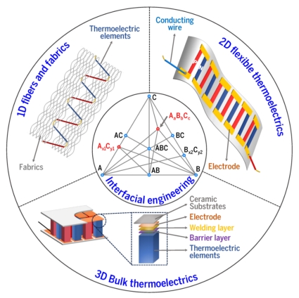 图3 研究进展:具有多维结构的热电器件。其中强调了基于多元相图计算的界面筛选设计对于提升器件转换效率的重要性。