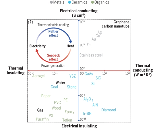 电传输和热传输决定了材料的基本物理特性,二者之间的不同组合可提供多样化的材料应用前景,如图1所示。其中,高导电而热绝缘的热电材料,能够通过塞贝克效应和帕尔帖效应分别实现温差发电和电子制冷。在当前能源重大战略需求的背景下,热电技术以其高可靠性、无噪音、结构灵活、环境友好等优势,在废热回收、5G通信、激光制冷等关键领域都有着广阔的应用前景。然而,热电器件低的转换效率限制了其广泛应用。要实现更高的能源转换效率,需要有效解耦热传输-电传输之间的矛盾。