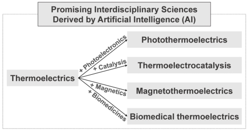 图5 研究展望:可人工智能驱动的基于热电科学的多个新兴交叉领域。潜在的交叉方向主要包括热电-光电学、热电催化学、热电磁学和生物热电学等。