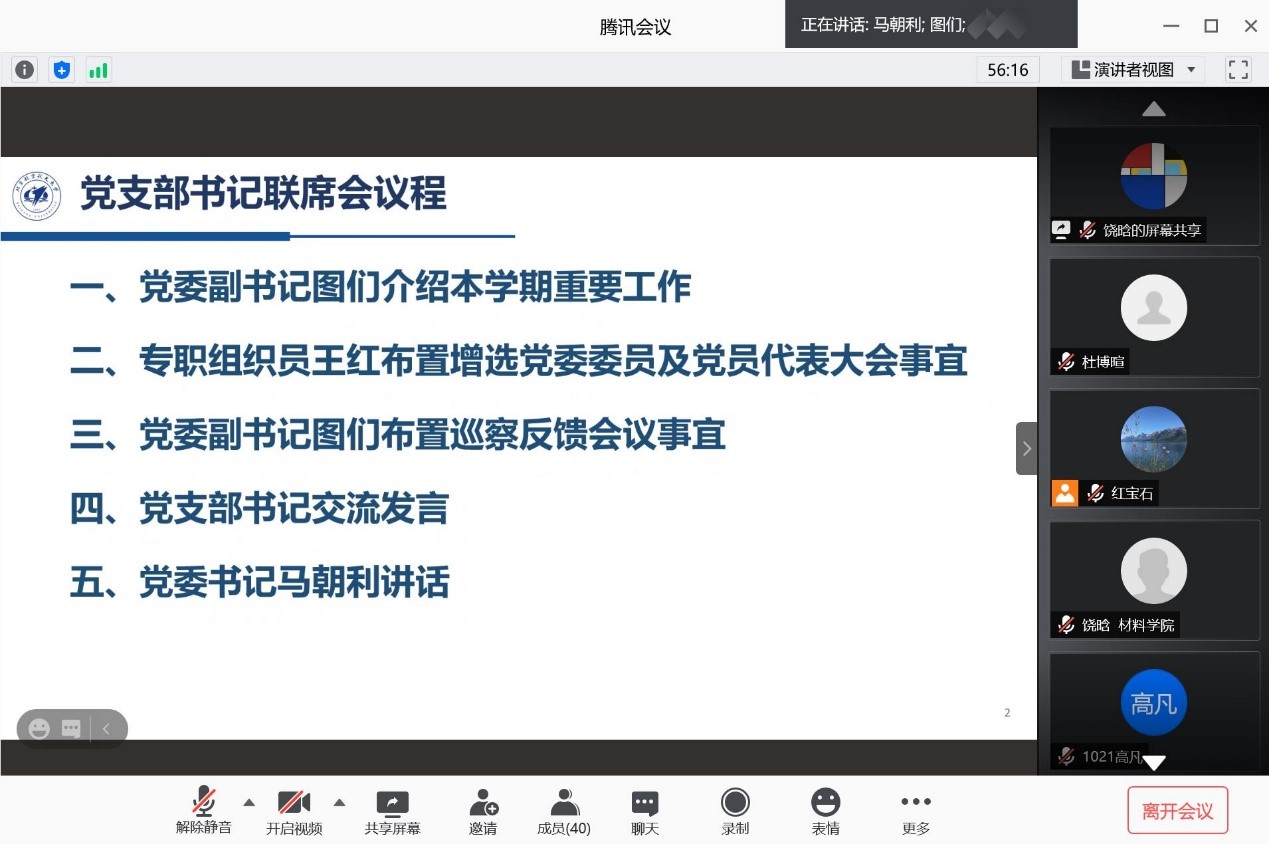 (通讯员 于万欣)10月11日上午,公司党支部书记联席会通过腾讯会议平台顺利召开,党委书记马朝利、党委副书记图们、专职组织员王红、教职工党支部书记、员工党支部书记、各年级辅导员参会。