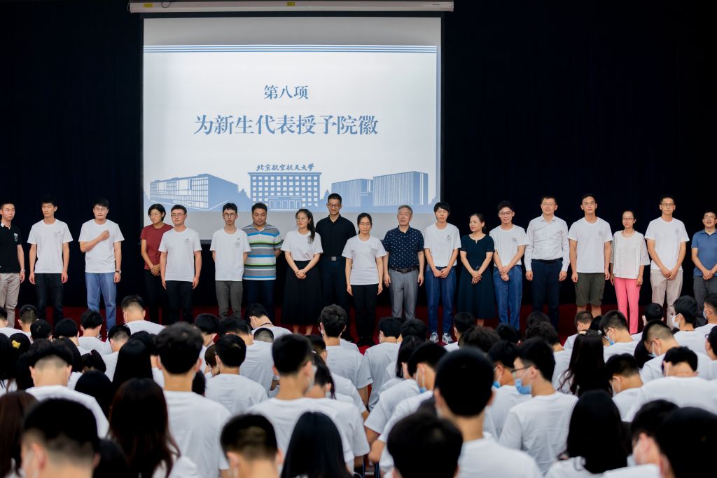 讲话结束后,在场领导、嘉宾为新生代表授予院徽。