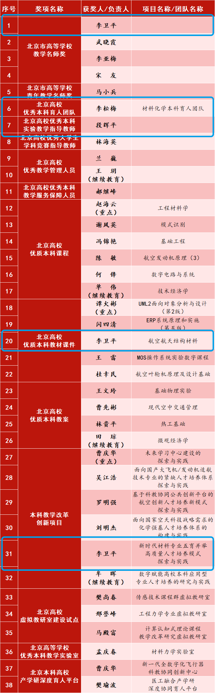 近日,2023年北京高校本科教学项目建设评选结果公布,在14类教学项目评选中,北航共有38个项目获评,公司教师李卫平、李松梅、段辉平及其团队共斩获5项奖项。