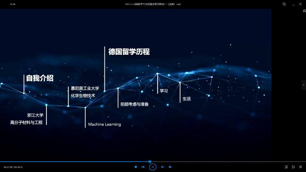(通讯员:郑锐)2021年11月20日傍晚6点,yl23411永利国际学术宣讲会在四号楼205成功举办。本次宣讲会邀请到本科毕业于浙江大学高分子与科学工程学系,目前就读于德国慕尼黑大学的张雨琪为同学们传授国外科研学习经验并对留学经历加以分享。