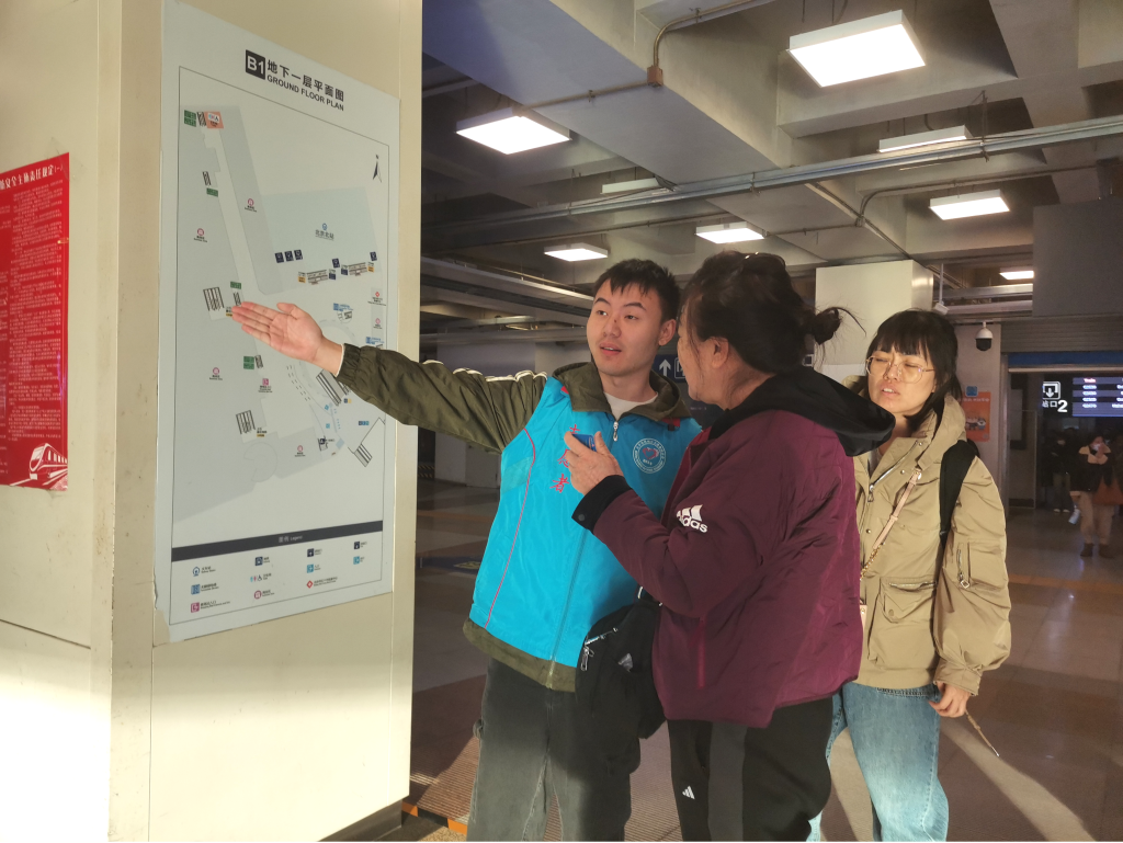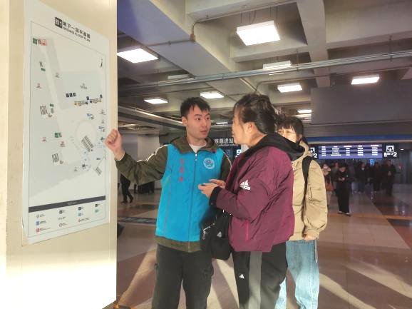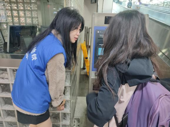 在进出站口,他们为有进出站困难的乘客解决实际需求,收获了乘客们以及地铁工作人员的一致好评。也许交织的交通网络会让人一头雾水陷入迷茫,也许井然有序的地铁不会为驻足的行人过多停留,但同学们的热心服务可以使迷途者归航,可以为驻足者解惑,快速又坚定地走向应去的方向。冰冷的机器因为有了铁路工作人员的辛劳,有了志愿服务队的帮助,有了来来往往的行人而变得温暖,构成了城市发展中不断跳动的强大脉搏。