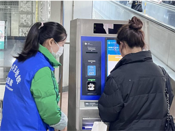 员工党员志愿服务队的队员们积极配合地铁工作人员,为乘客提供热情周到的服务与帮助。在售票处,队员们热情帮助迷途的乘客查询规划出行路线,并协助购买车票。