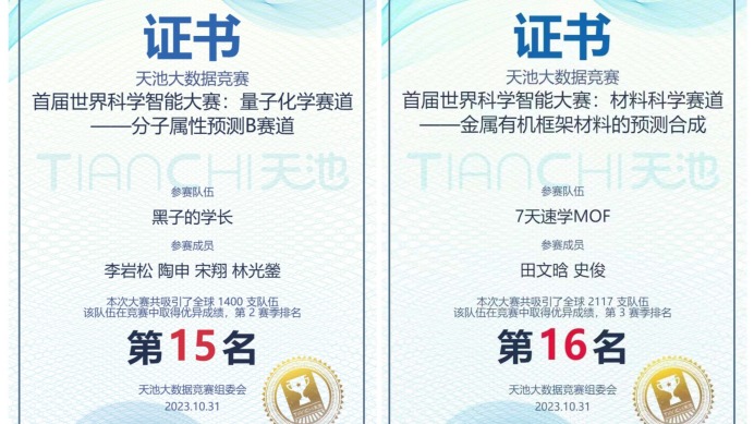 (通讯员 陶申)10月31日,阿里云天池平台联合发布首届世界科学智能大赛阶段性赛季落下帷幕。公司前沿科学技术创新研究院研究生李岩松、陶申、林光鎣、yl23411永利研究生宋翔组成的队伍在量子化学赛道——分子属性预测B赛道的1400支参赛队伍中脱颖而出,取得了第15名的优异成绩;yl23411永利研究生田文晗、史俊组成的队伍在材料科学赛道——金属有机框架材料的预测合成的2117支参赛队伍中脱颖而出,取得了第16名...